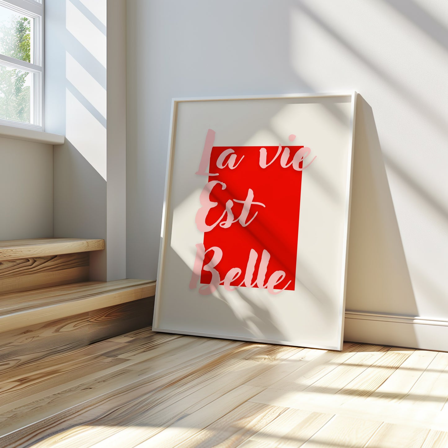 La vie est belle minimalistische poster. Roze tekst op een rode vlak met een beige achtergrond. Kracht in de simpelheid perfect voor een enorme knal aan kleur in je interieur.