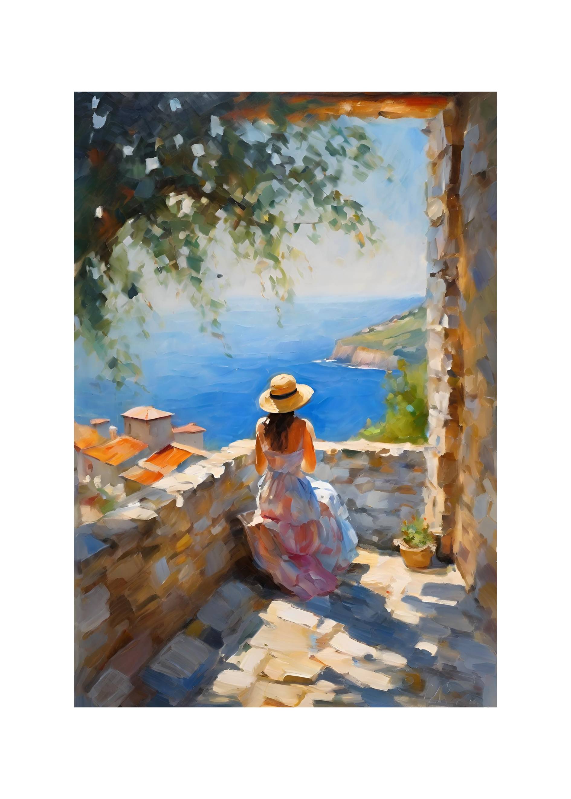 Een mooie geschilderde weergave van een vrouw welke uitkijkt op de zee vanuit een terras.